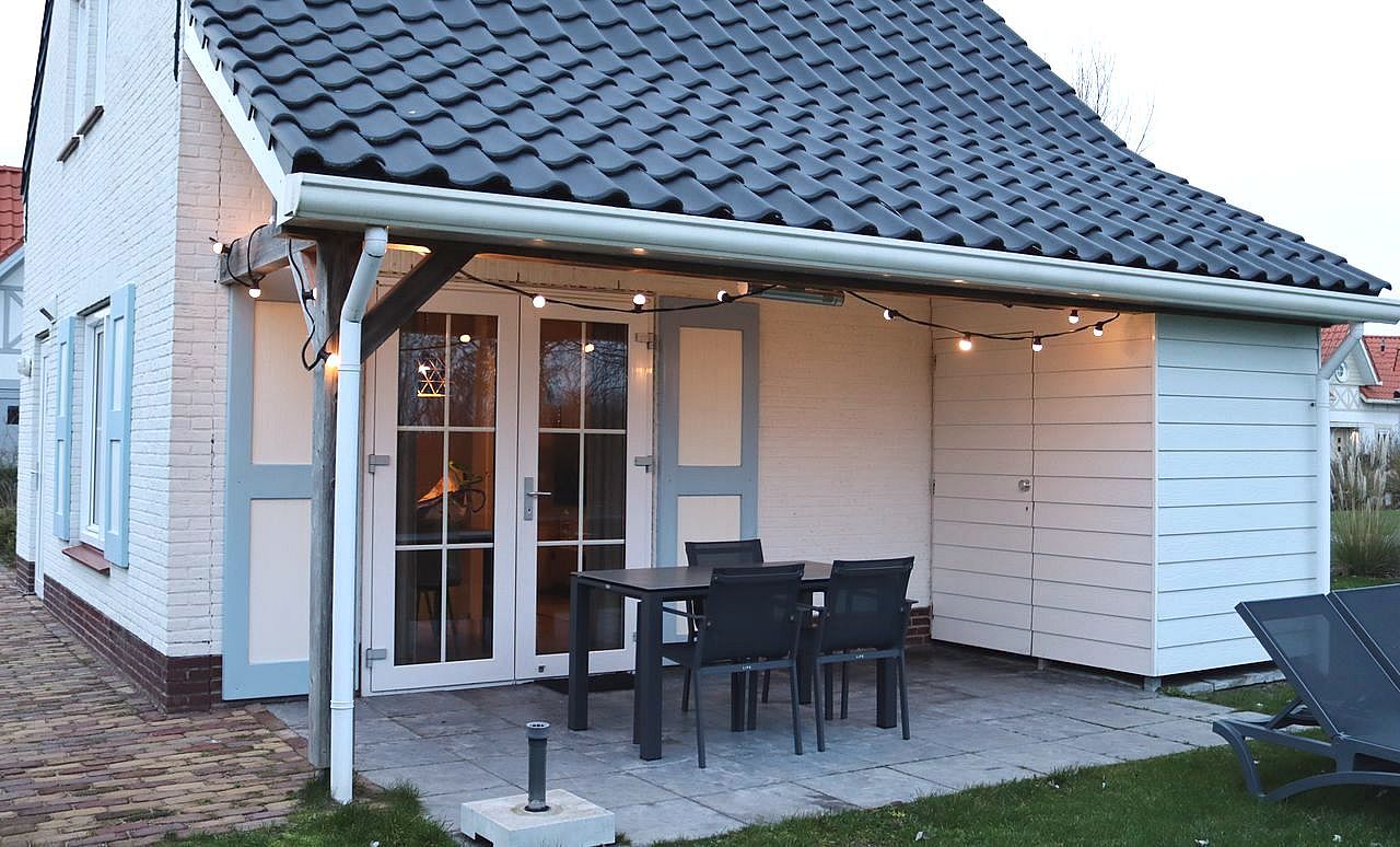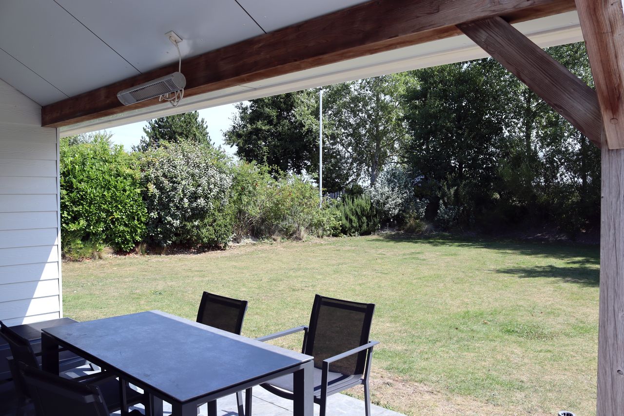 - Overdekt terras: terrastafel met 4 stoelen, 2 ligstoelen, heater