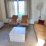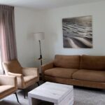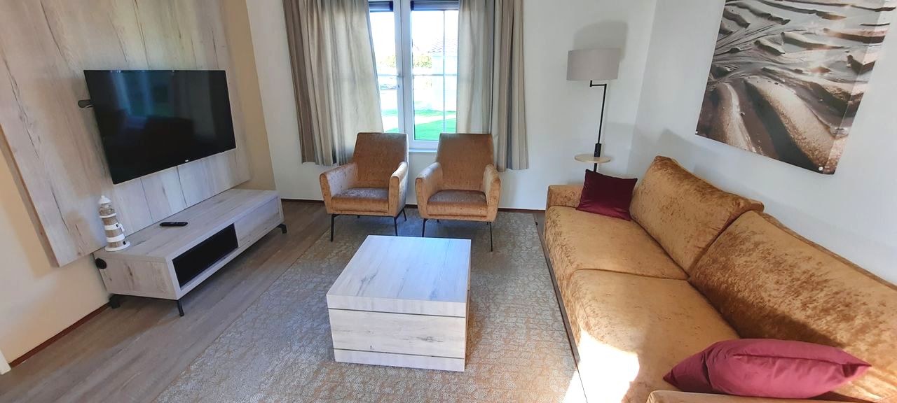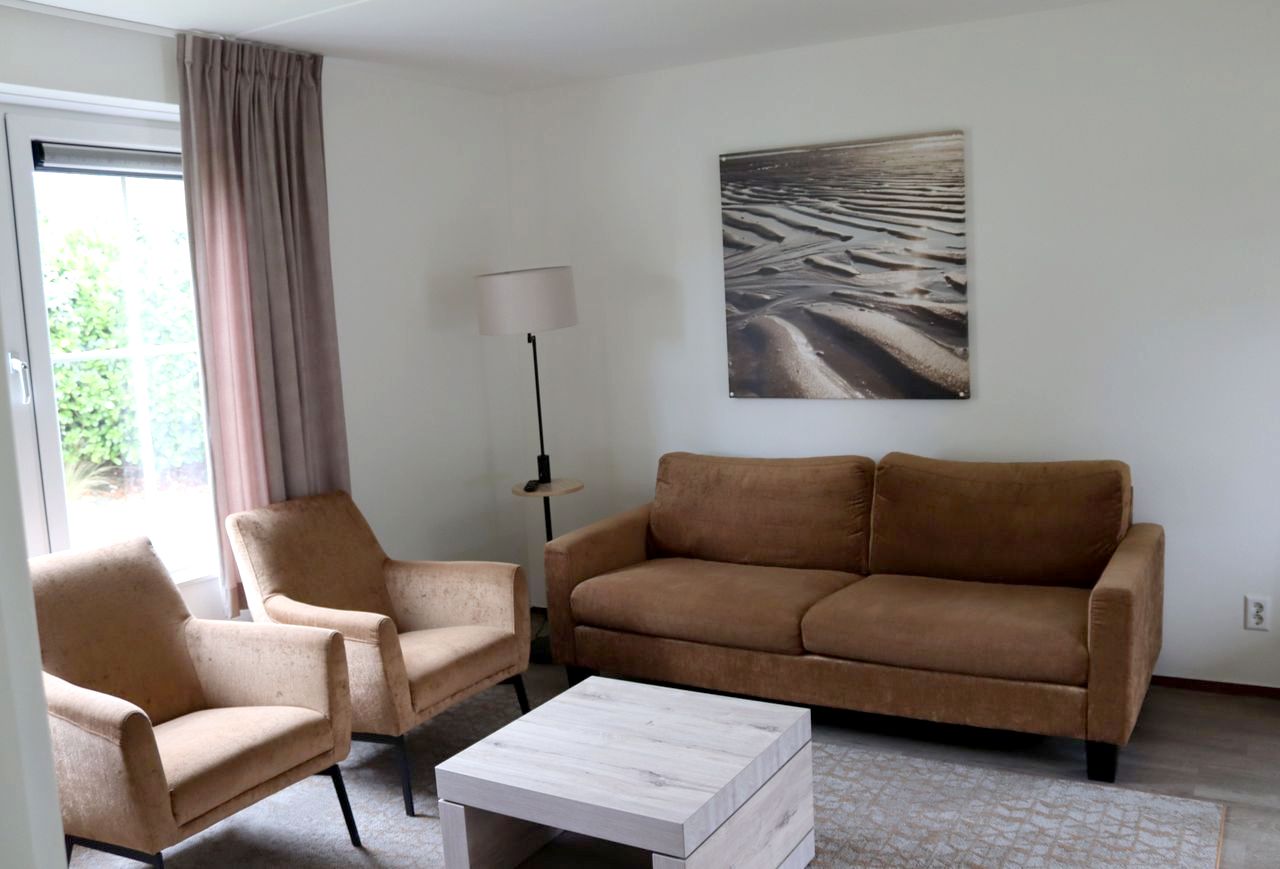 - Woonkamer: 3-zits bank + 2 x fauteuil, salontafel, dressoir, smart TV 50 inch, leeslamp
