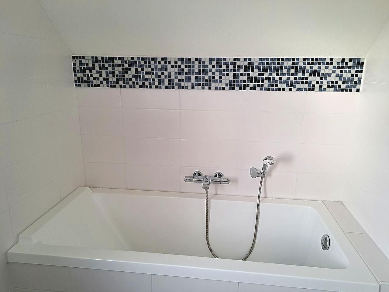 - Badkamer met ligbad: wastafel, ligbad, föhn, handdoekradiator