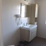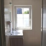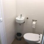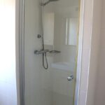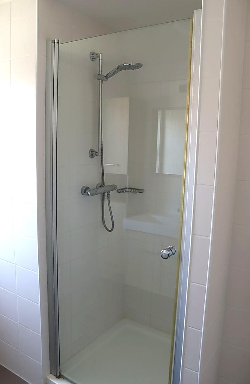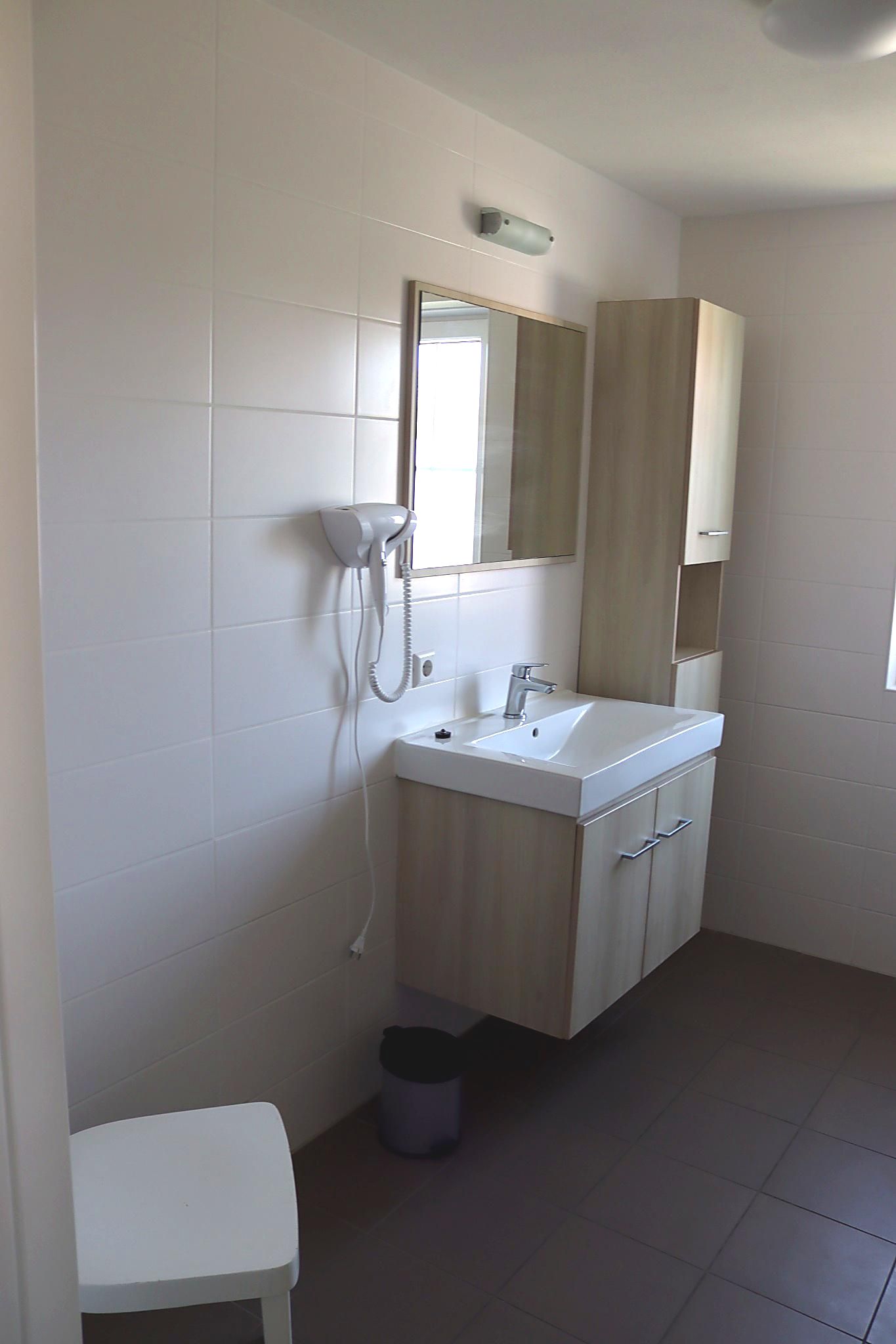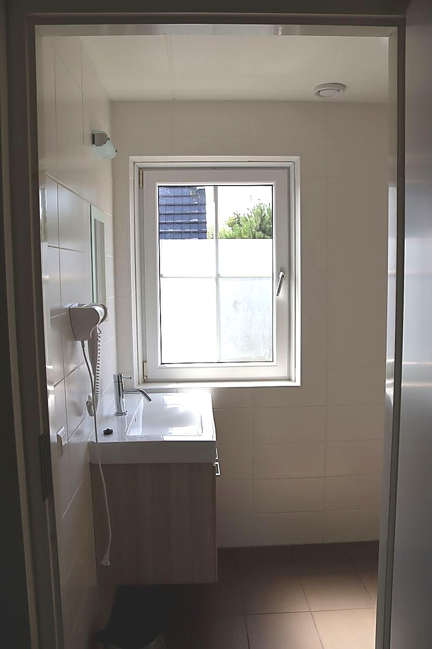 - Badkamer met douche: wastafel, douche, föhn, handdoekradiator